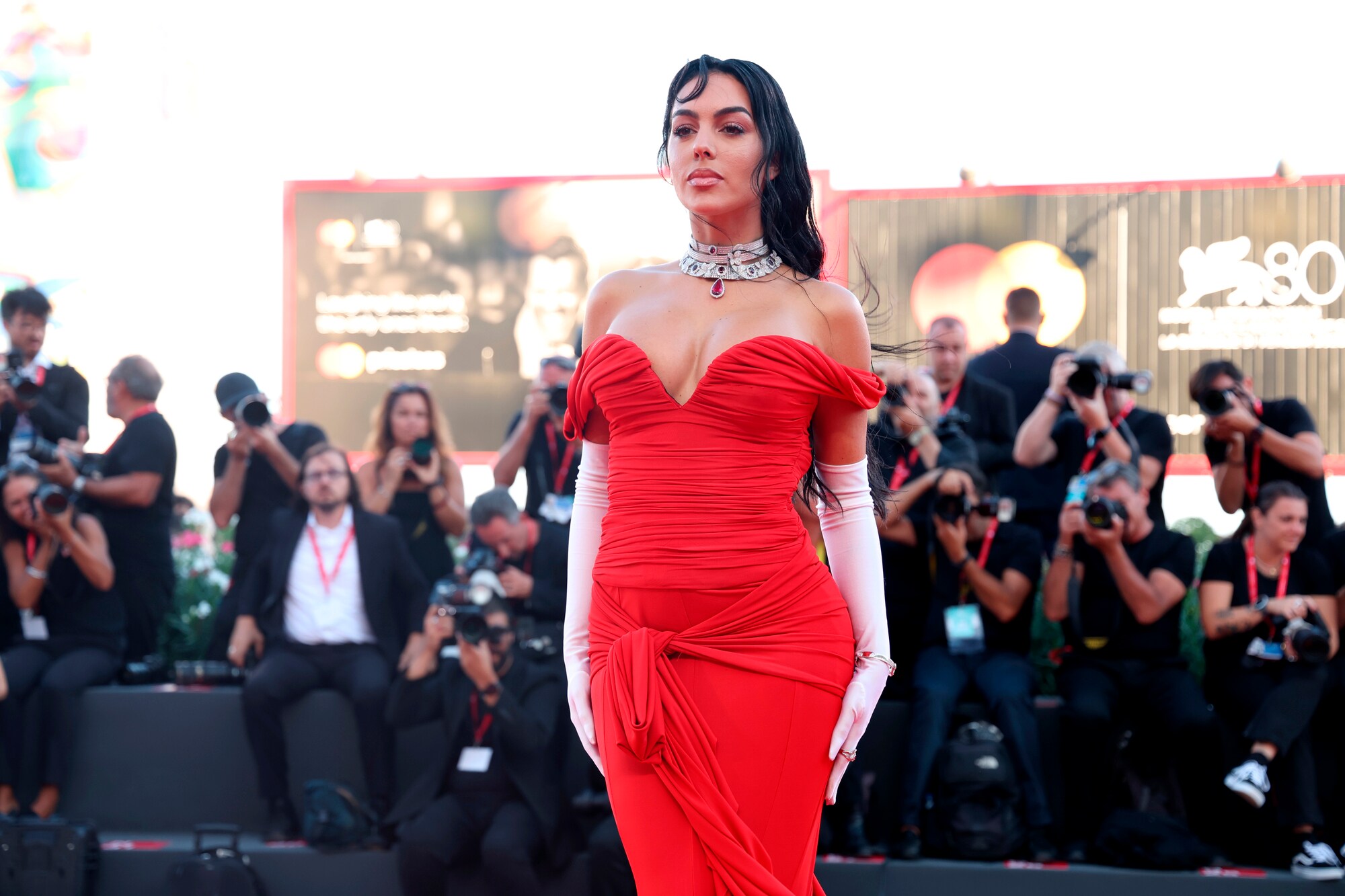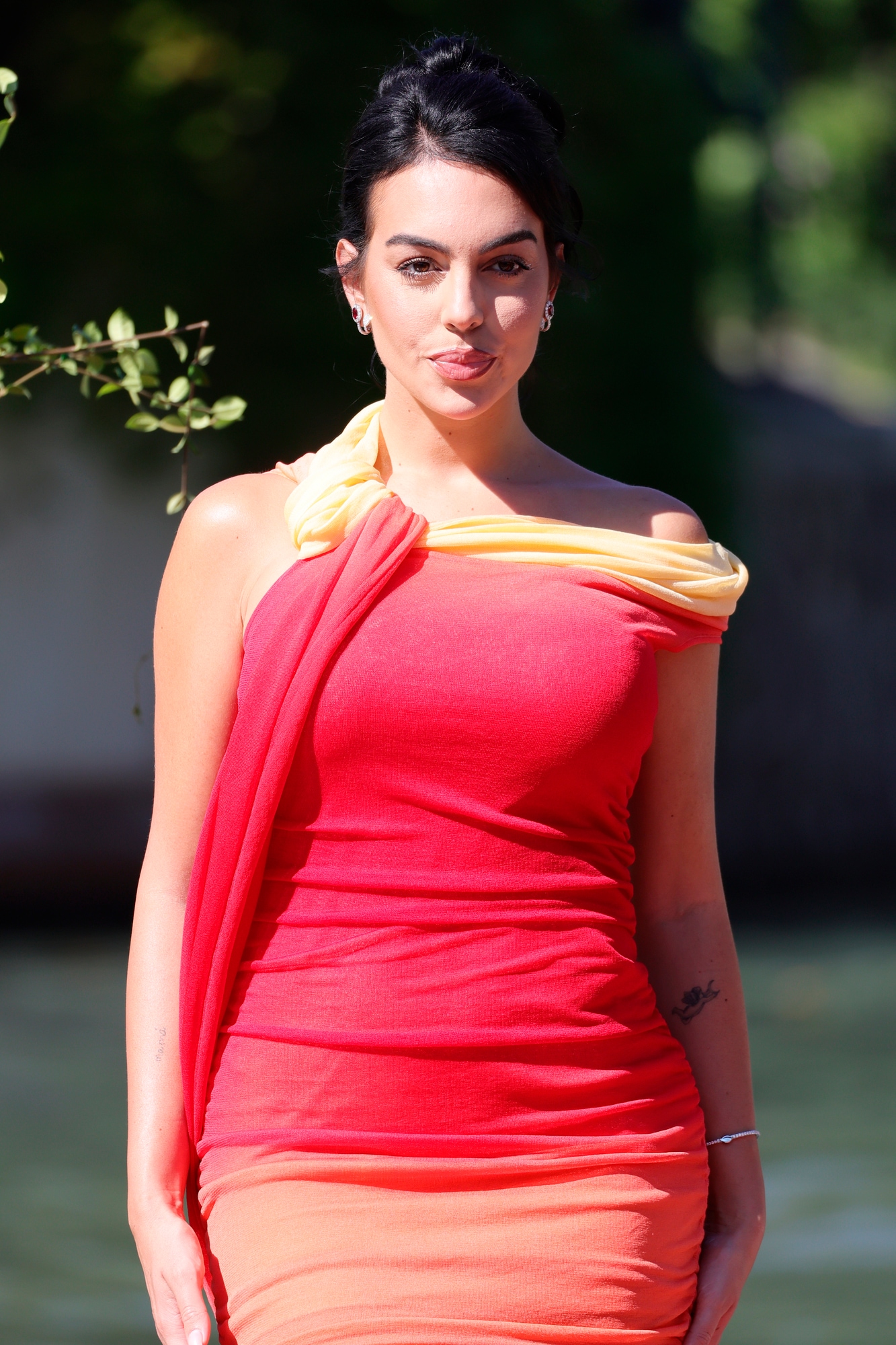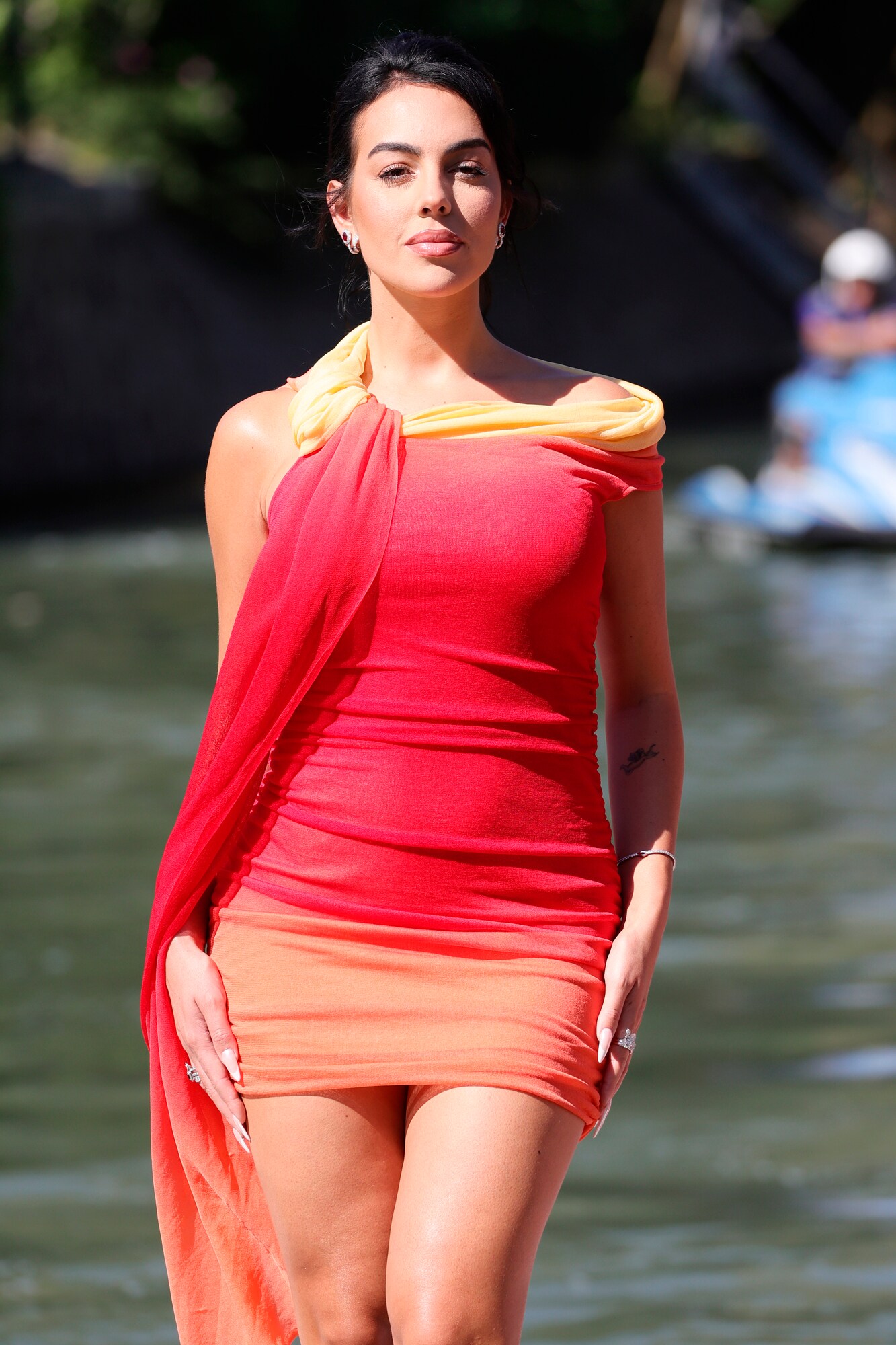 Il colorato arrivo dell'influencer e modella spagnola alla Mostra internazionale d'arte cinematografica