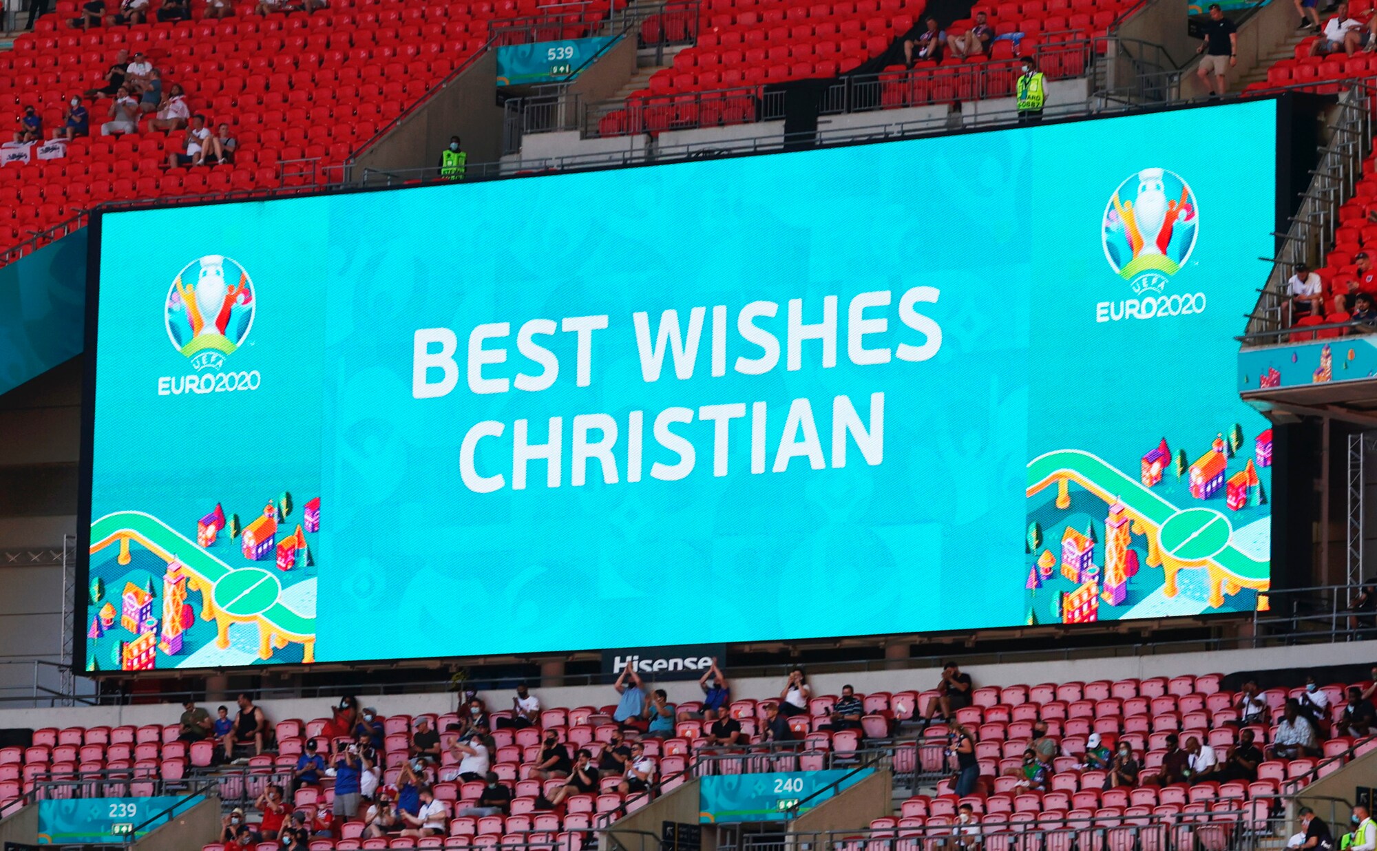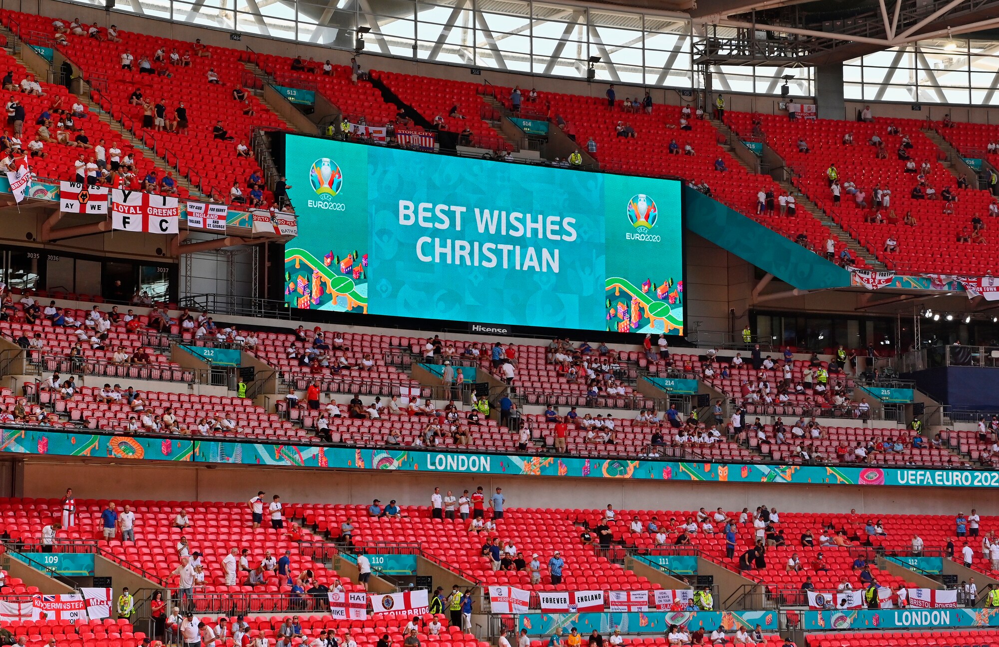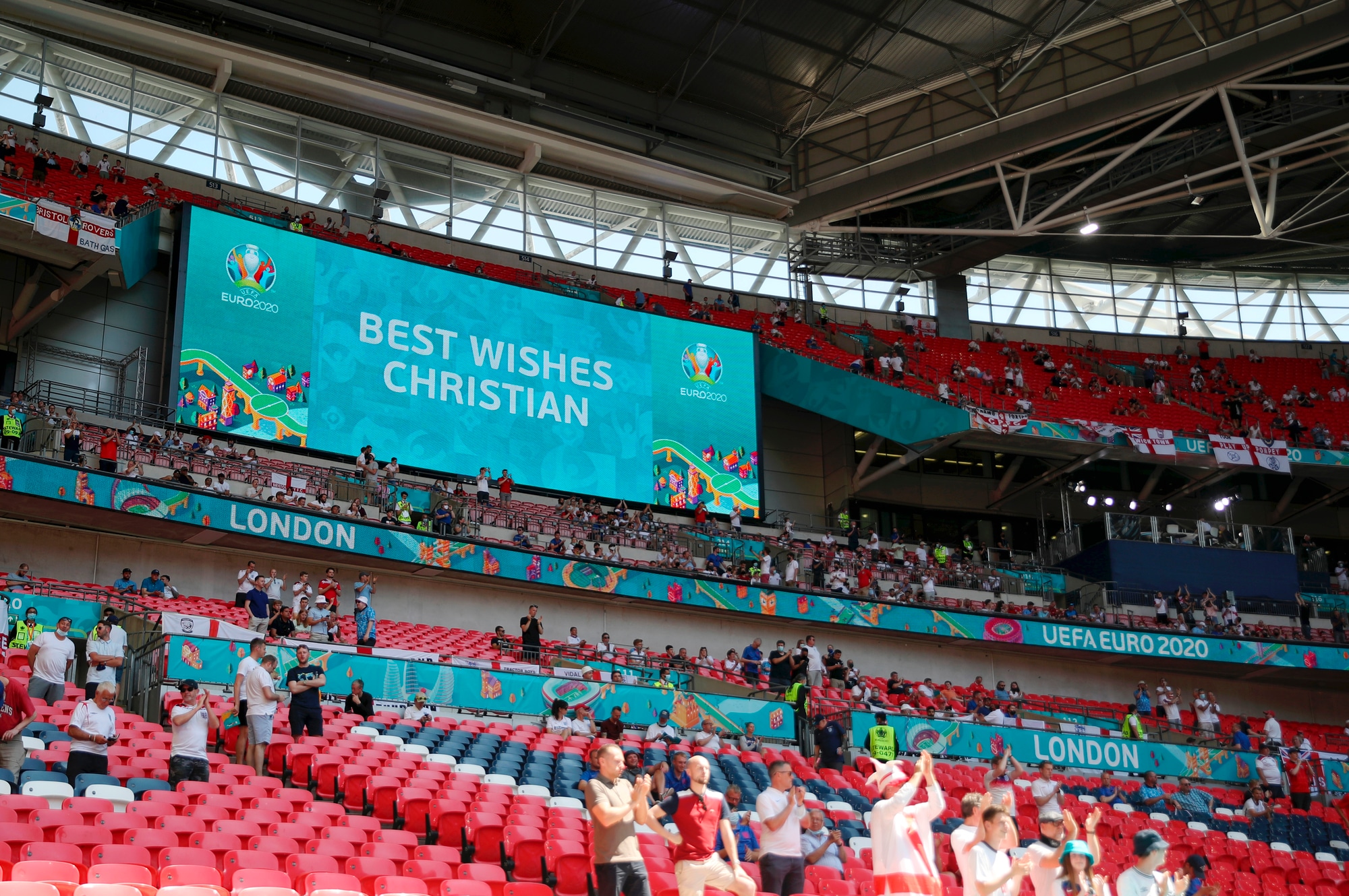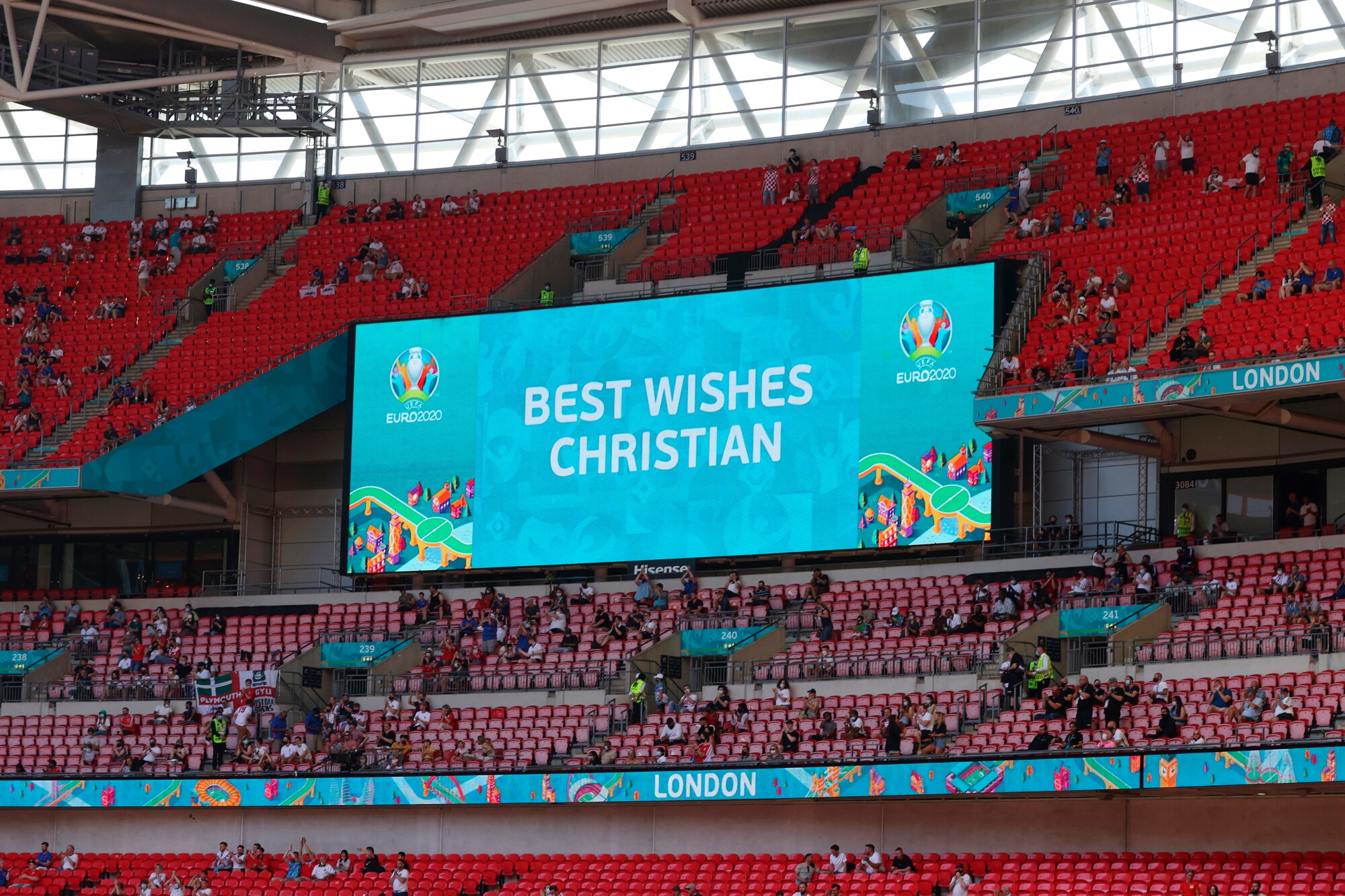 Lo stadio londinese ha omaggiato il centrocampista danese prima di Inghilterra-Turchia, prima gara del gruppo D a Euro 2020
