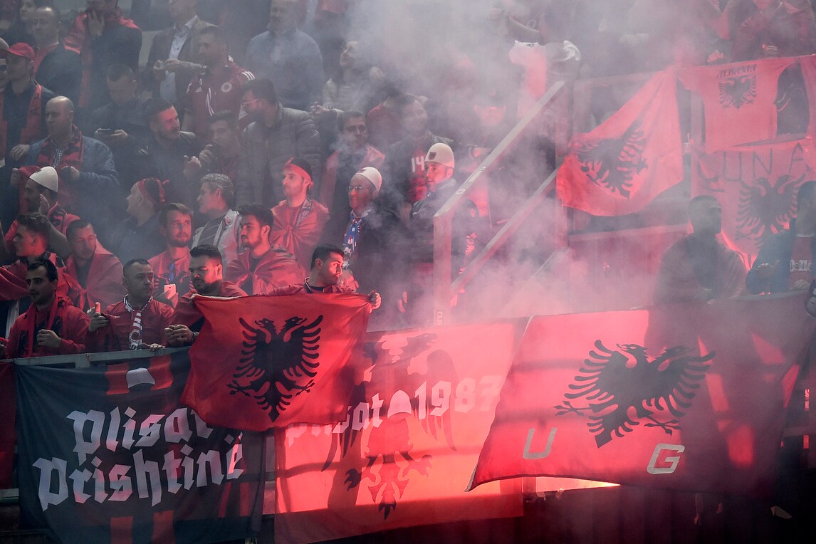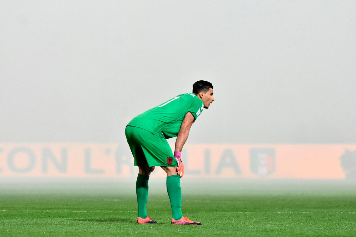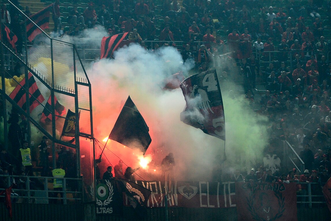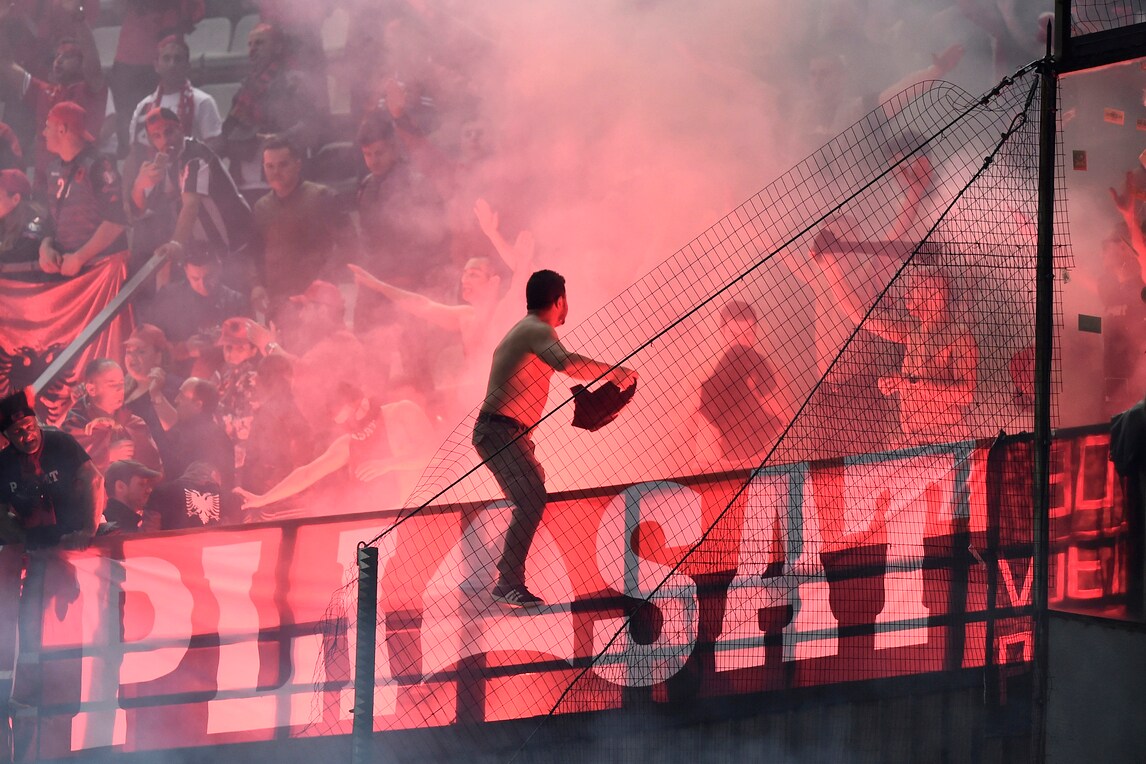 Al 13' del secondo tempo, l'arbitro sloveno Vincic manda le squadre negli spogliatoi al Barbera per il ripetuto lancio di petardi in campo da parte dei tifosi albanesi. Il match può riprendere dopo 8'