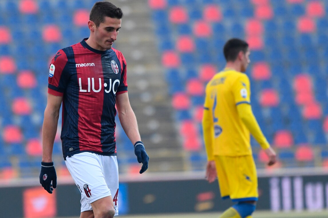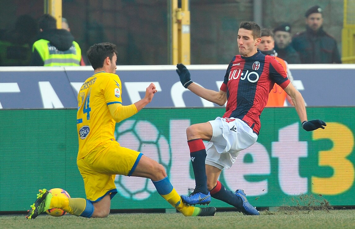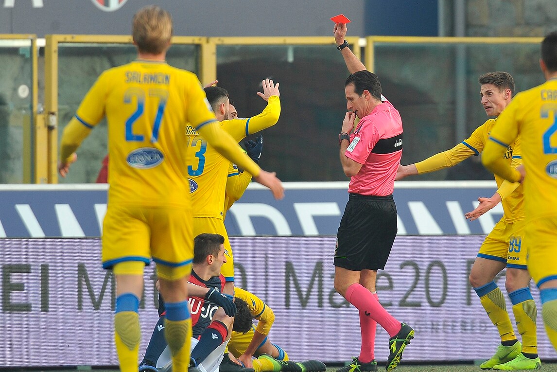 Il terzino del Bologna entra col piede a martello su Cassata lasciando i suoi in dieci contro il Frosinone