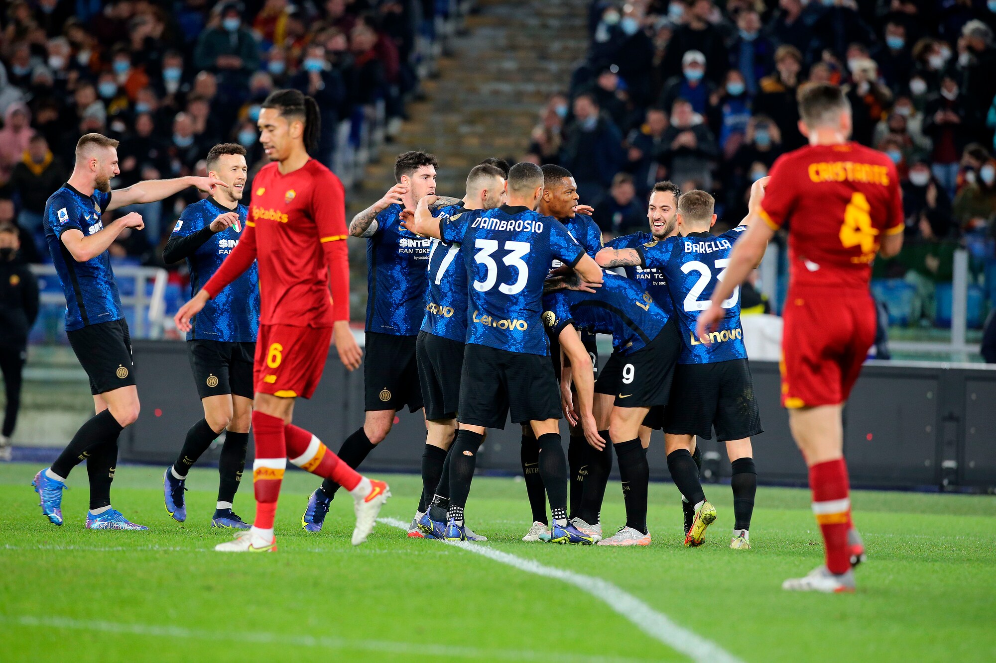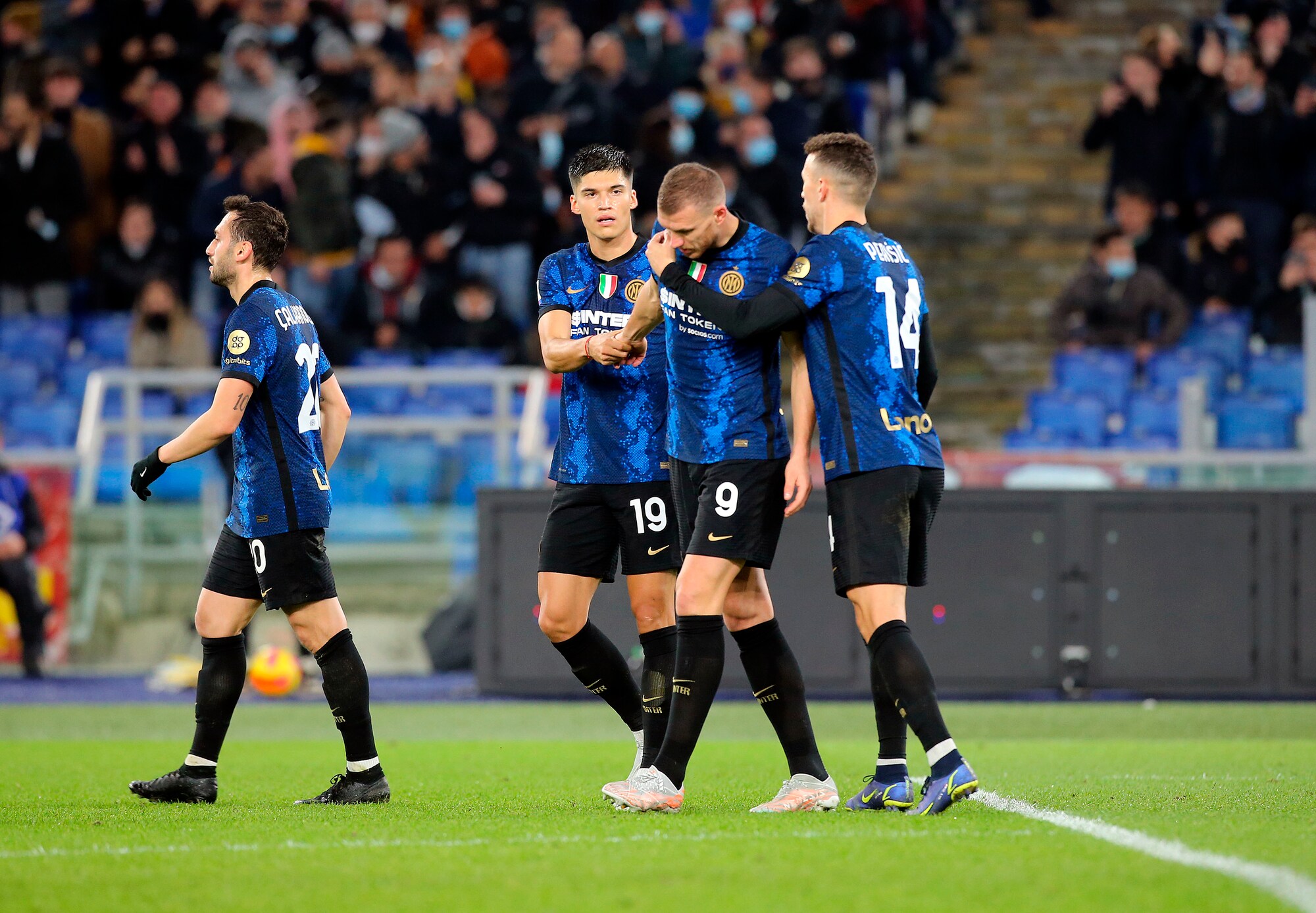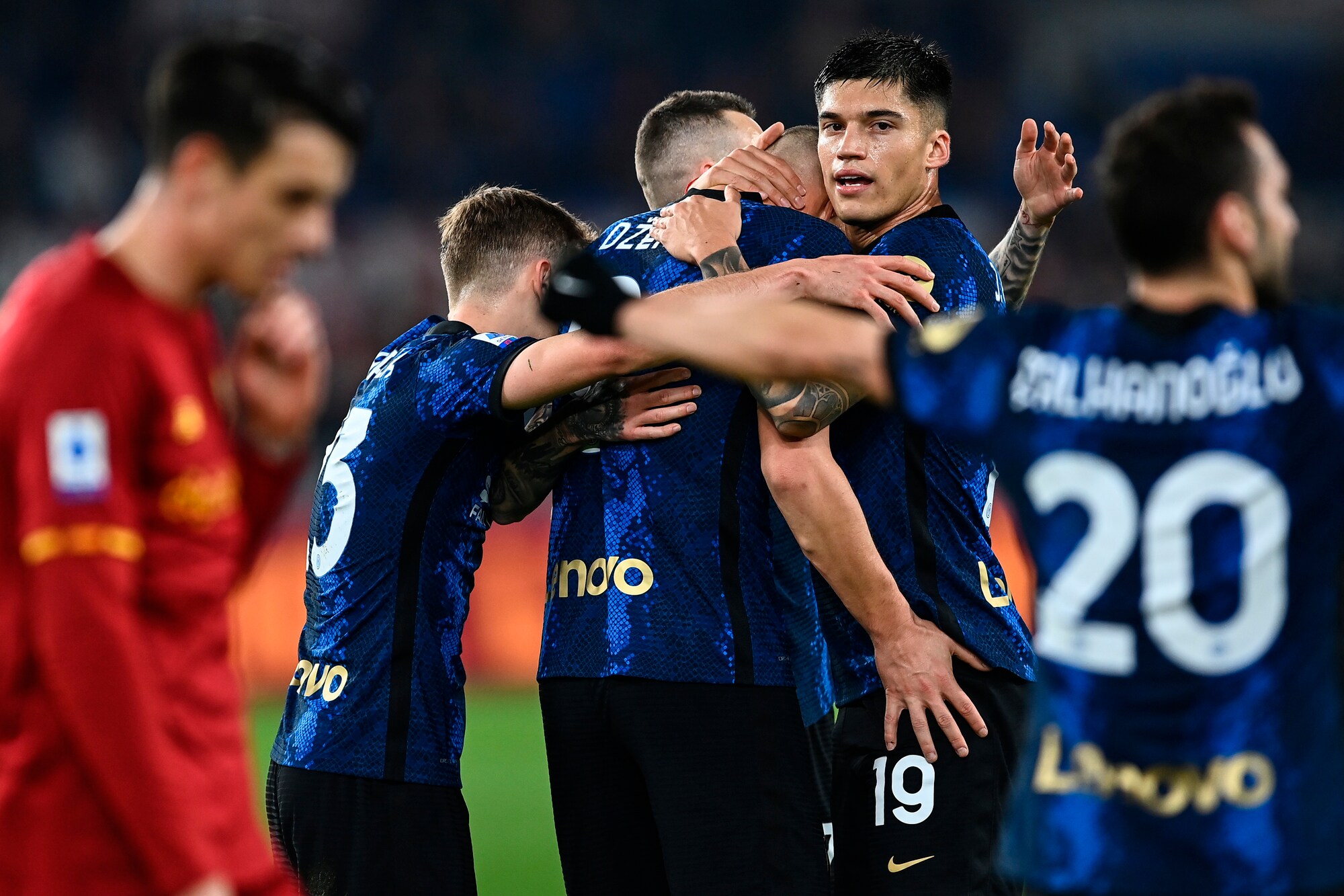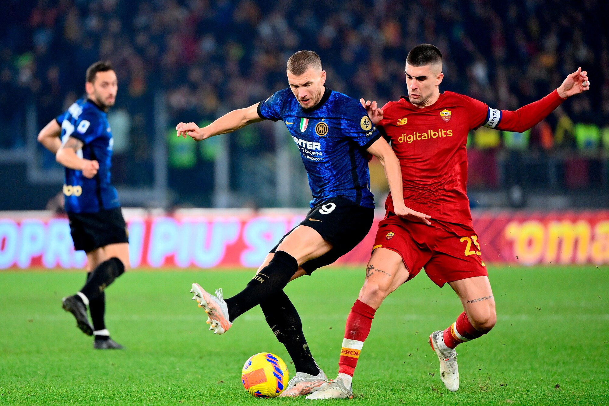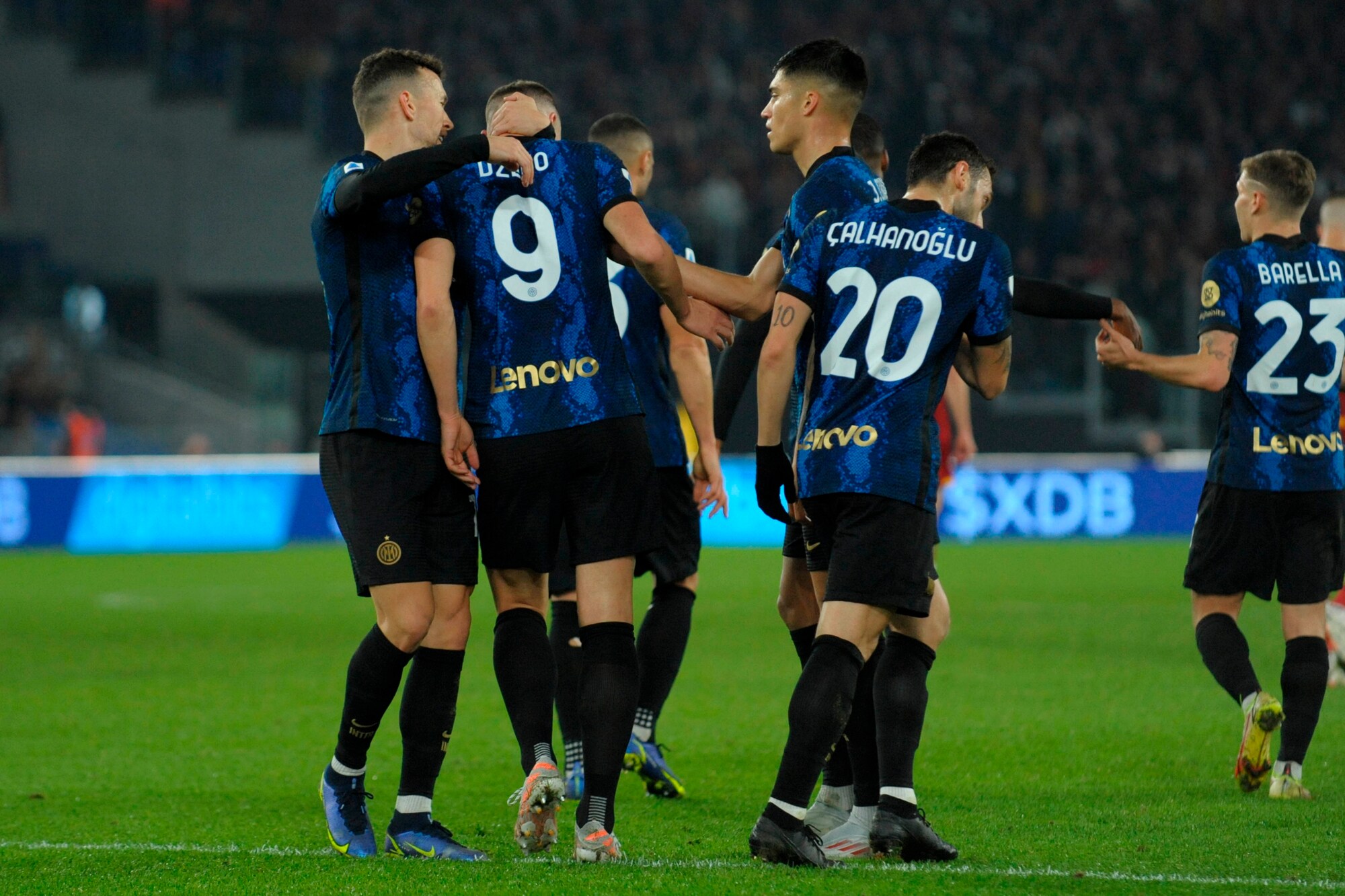 I nerazzurri vincono 3-0 in casa dei giallorossi: a segno Calhanoglu, il bosniaco e Dumfries