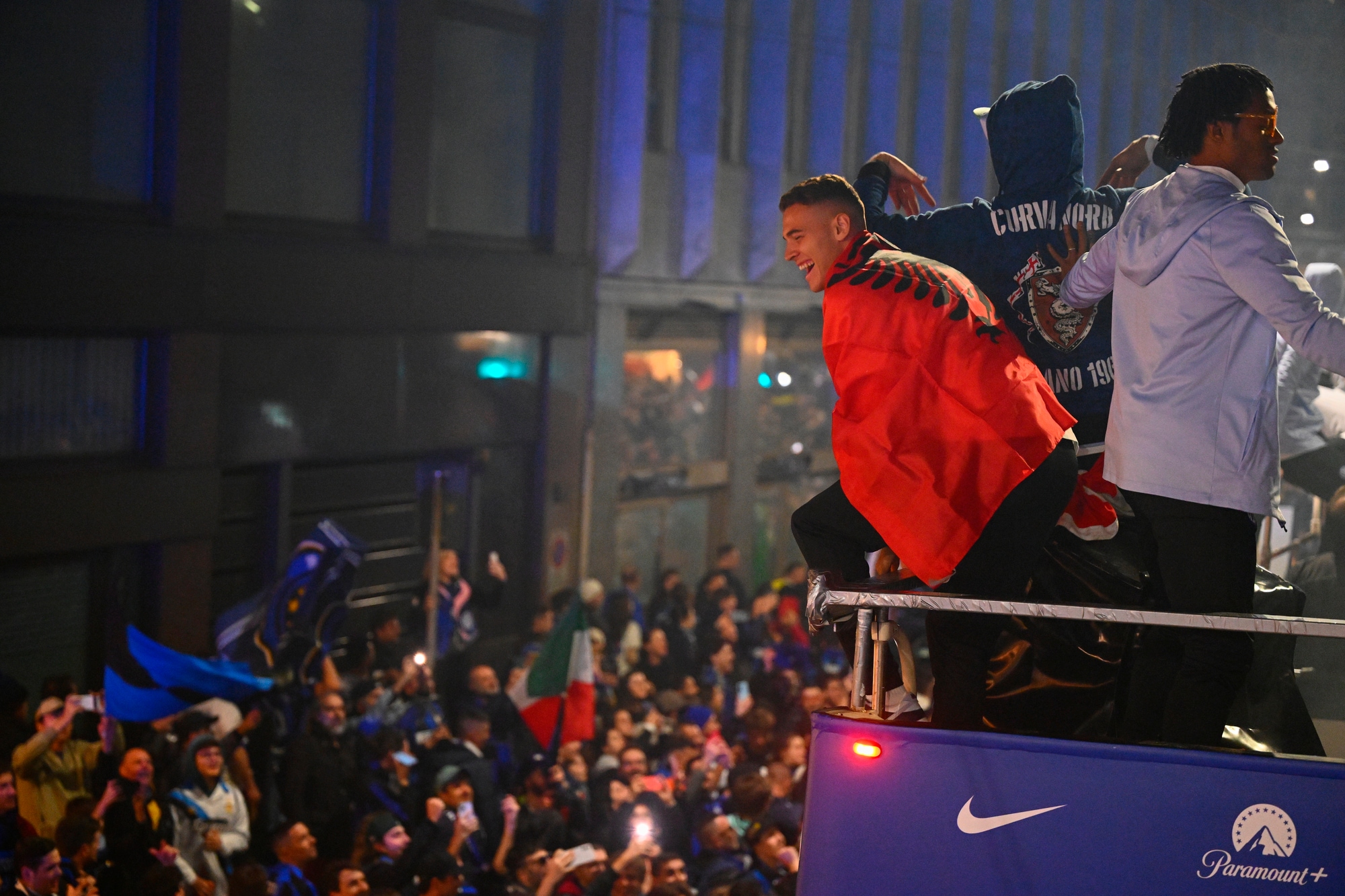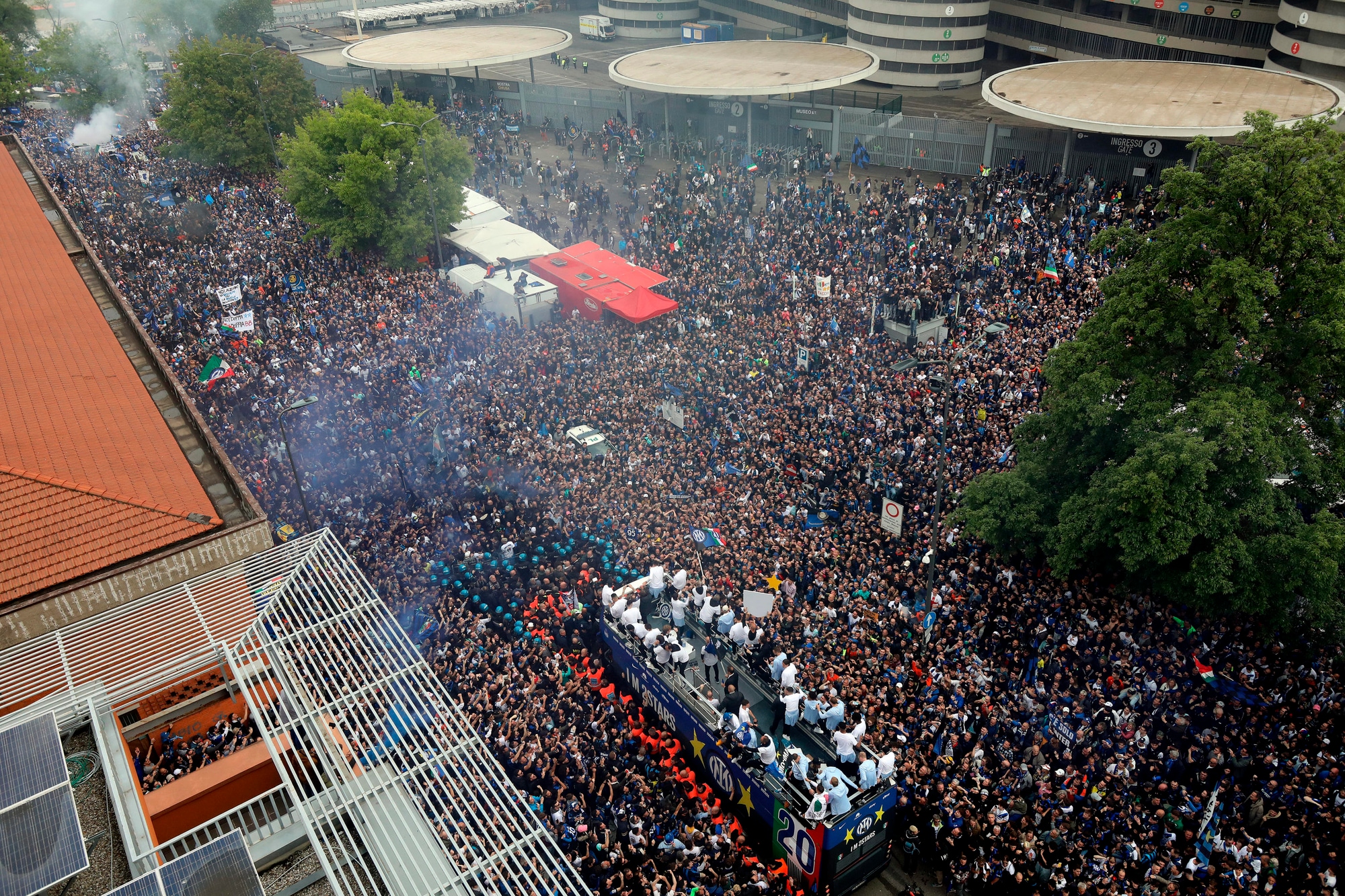I nerazzurri hanno attraversato la città a rilento per via della presenza di moltissimi supporters. Lautaro e compagni hanno festeggiato il tricolore lanciando cori e cantando insieme ai tifosi. I due autobus scoperti su cui sono saliti squadra e staff sono arrivati in Piazza Duomo dopo oltre sette ore dalla partenza da San Siro: ad accogliere i giocatori campioni d'Italia oltre centomila tifosi che hanno riempito la piazza fin dalle prime ore del pomeriggio (salendo anche sulla statua equestre) e che hanno celebrato l'arrivo dei calciatori con fuochi d'artificio, cori e fumogeni.