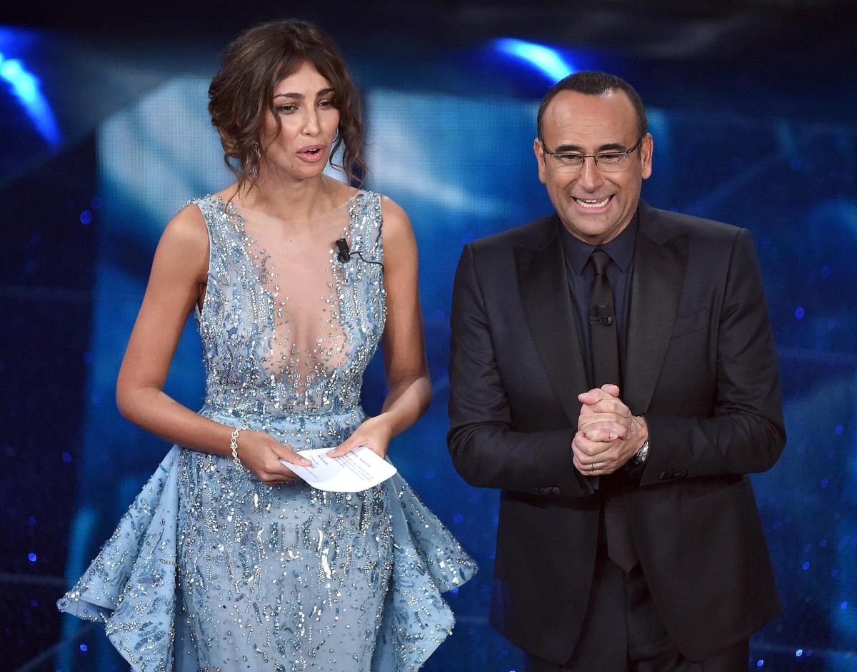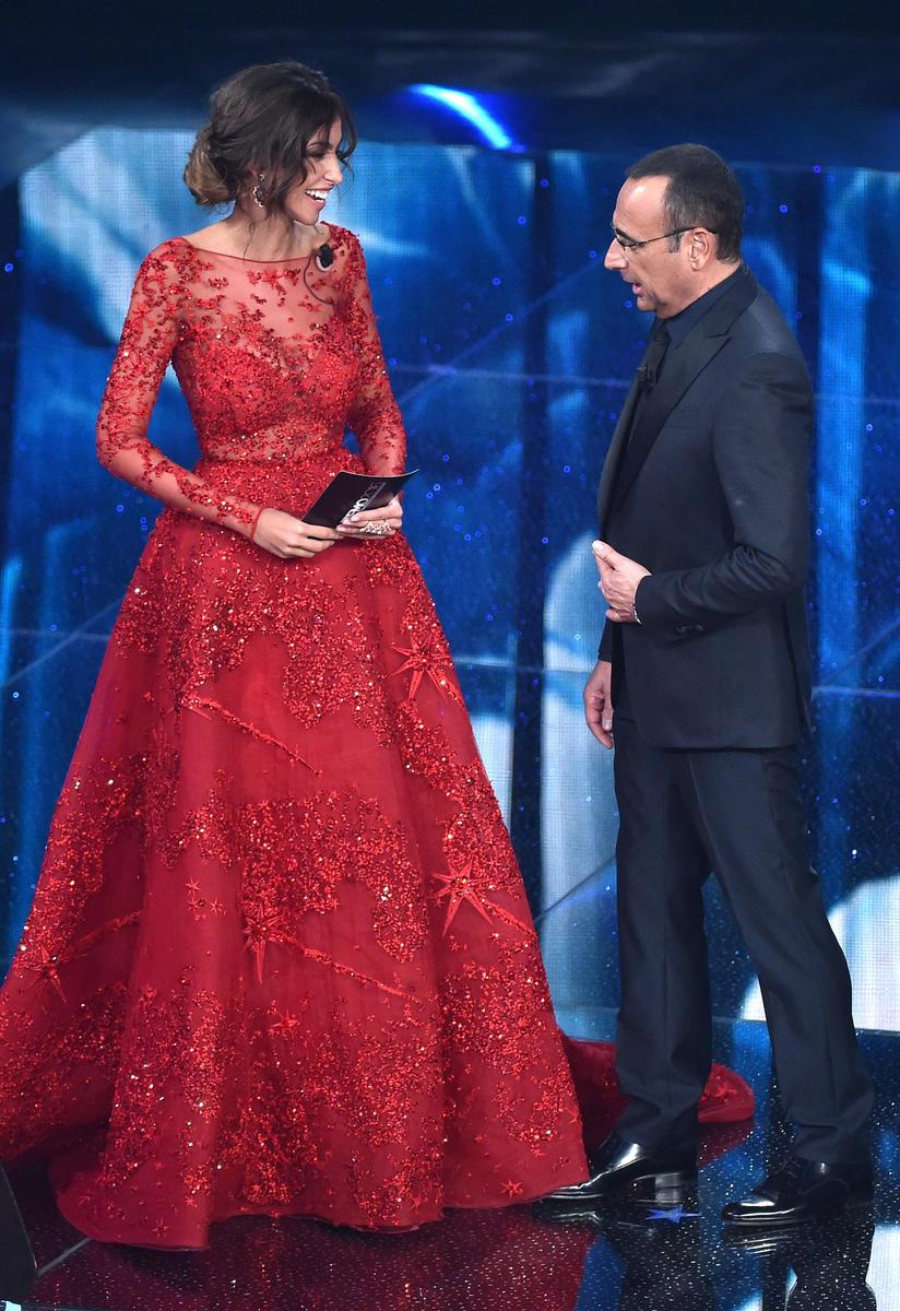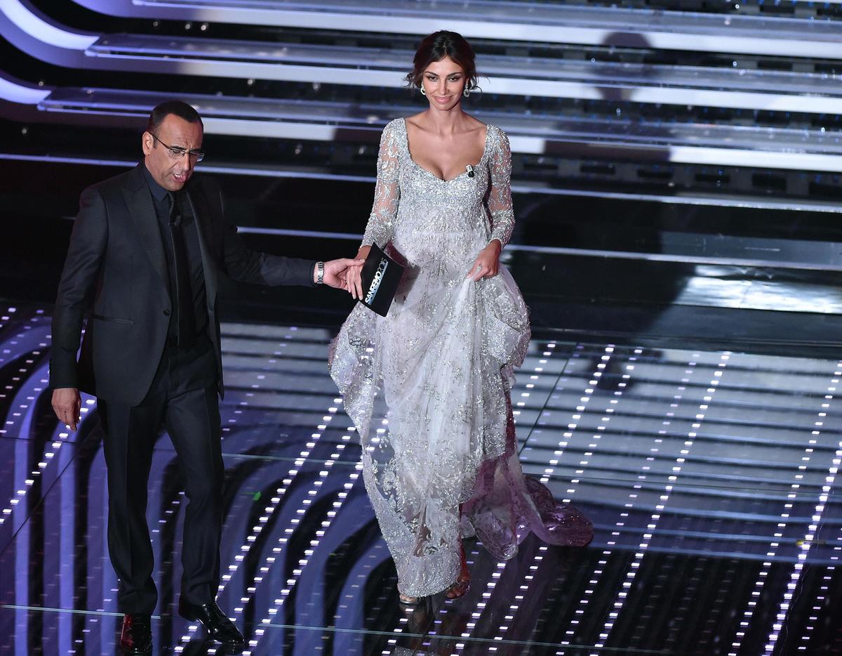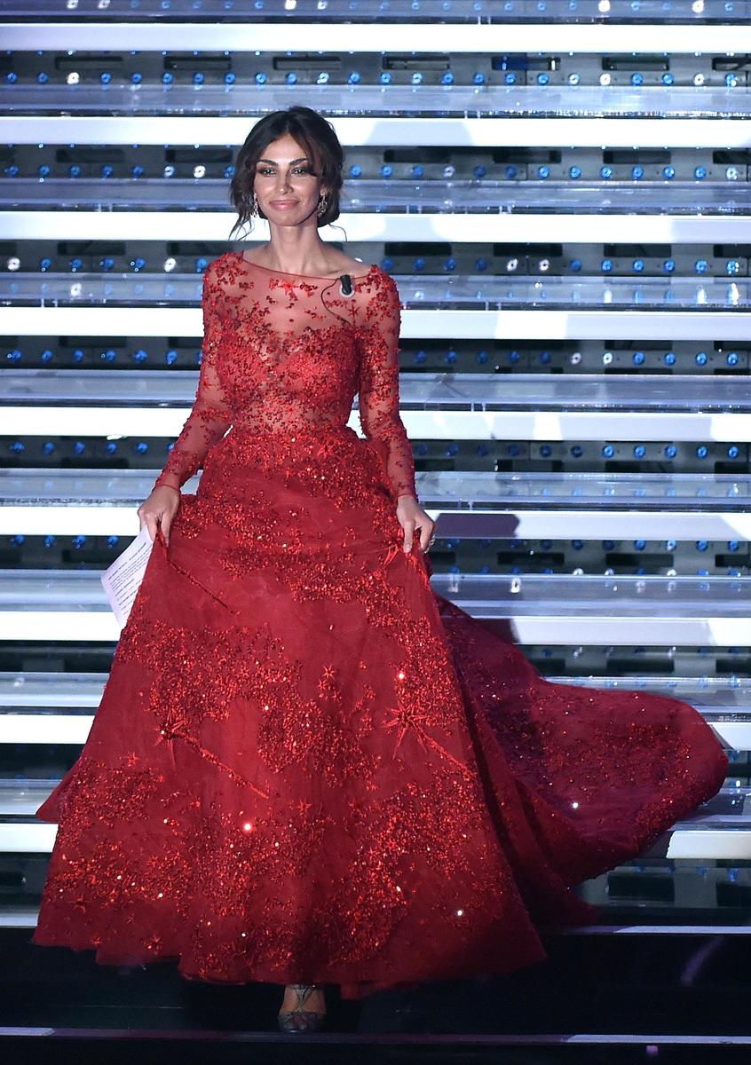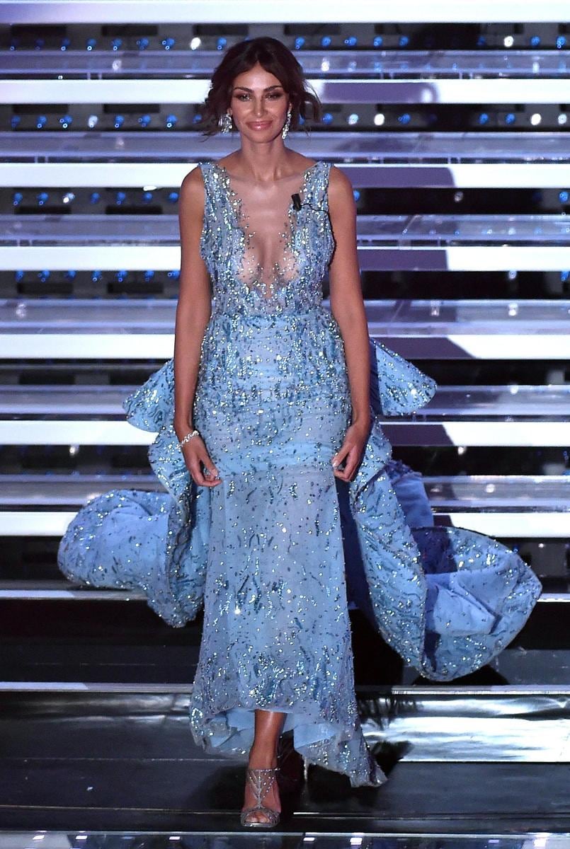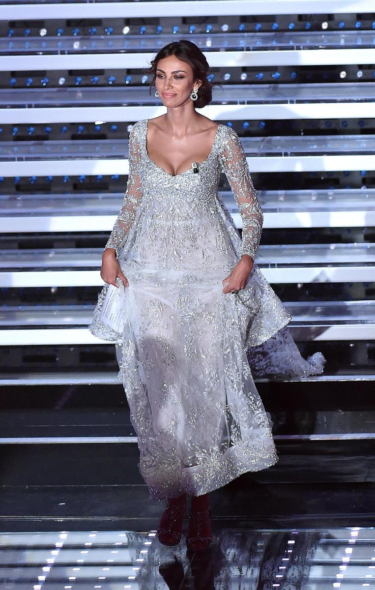 L'attrice e modella rumena indossa abiti con scollature mozzafiato durante la seconda serata del Festival della Canzone italiana