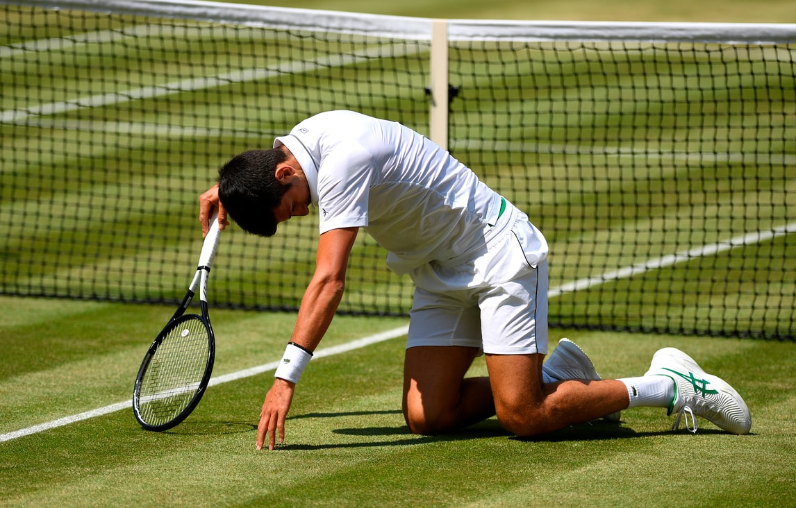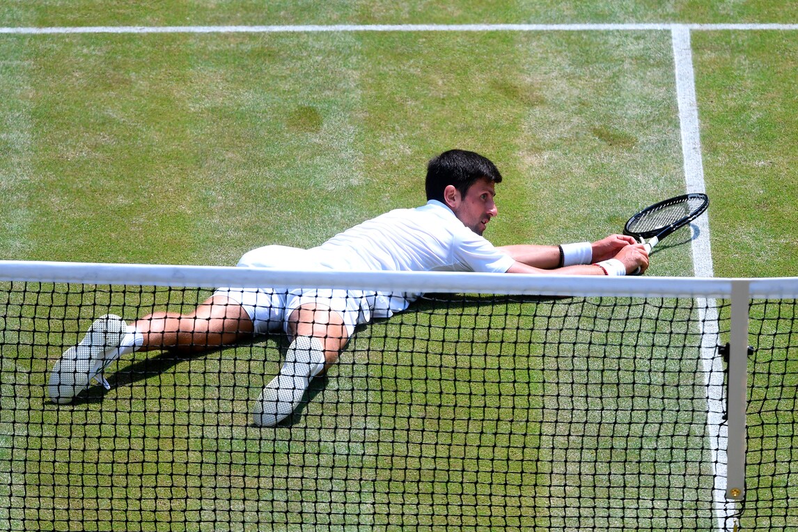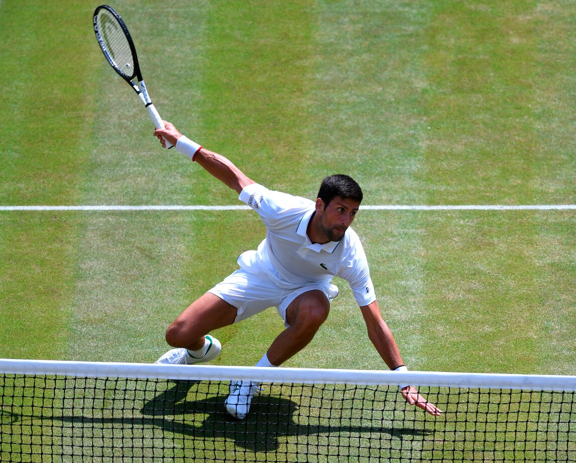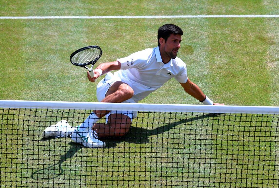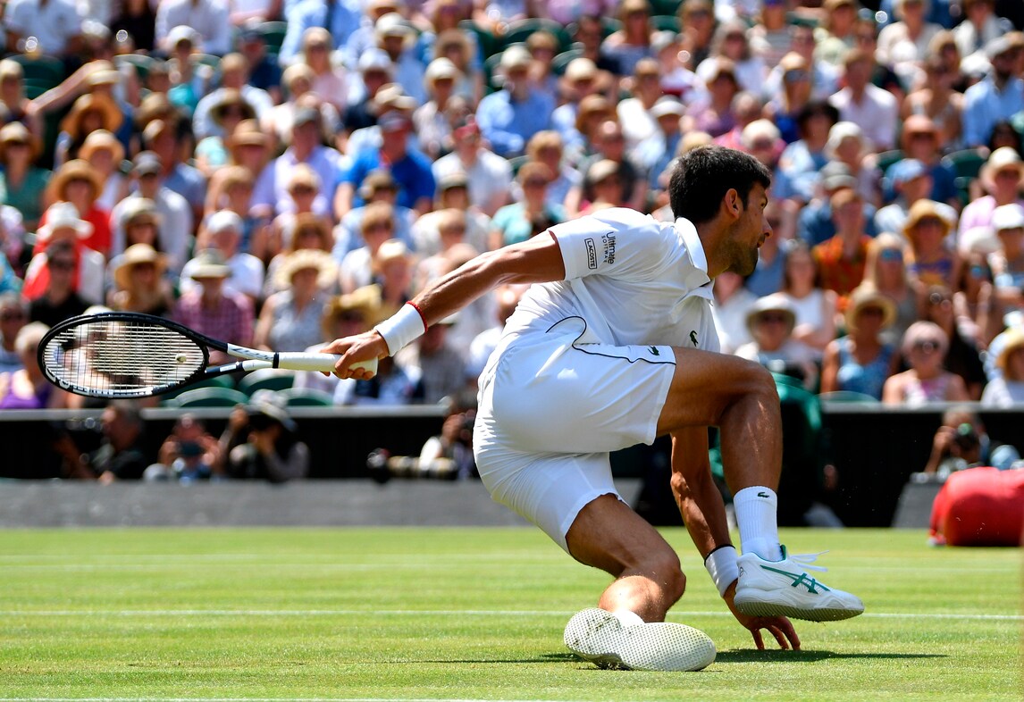 Il campione serbo dà spettacolo sull'erba di Londra nella semifinale con lo spagnolo Roberto Bautista Agut. Per raggiungere la pallina tenta tutte le strade, anche le più rischiose...