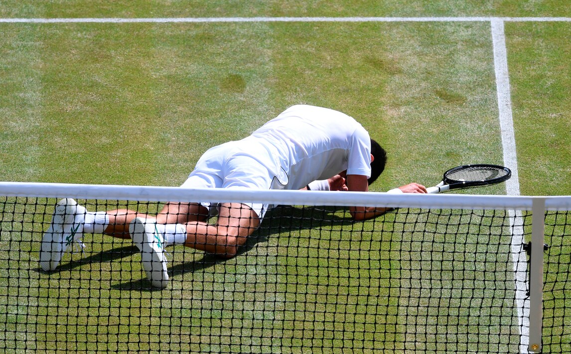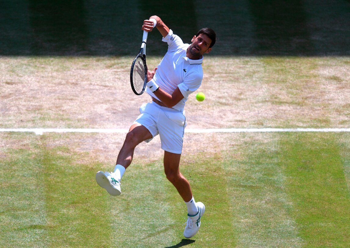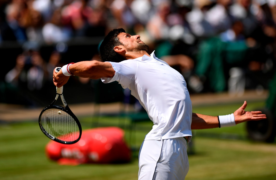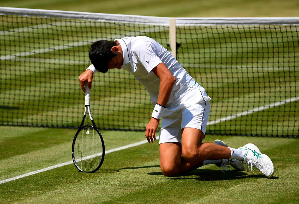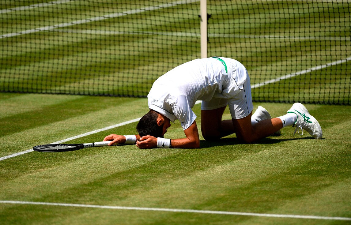 Il campione serbo dà spettacolo sull'erba di Londra nella semifinale con lo spagnolo Roberto Bautista Agut. Per raggiungere la pallina tenta tutte le strade, anche le più rischiose...