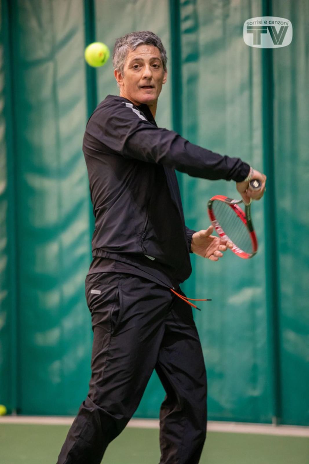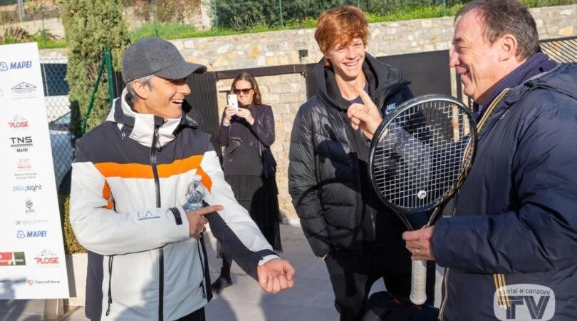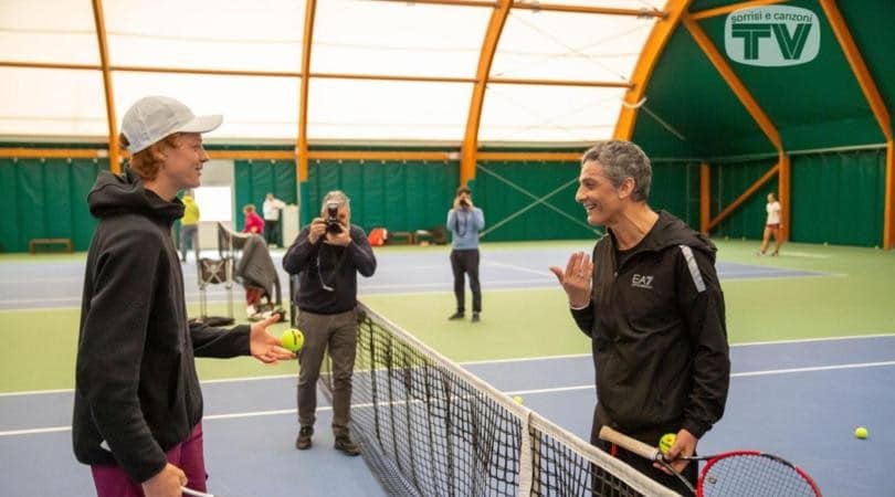 Il popolare showman, reduce dalla gag con Djokovic al Festival della Canzone Italiana, si rilassa con la racchetta giocando con il giovane talento azzurro a Bordighera