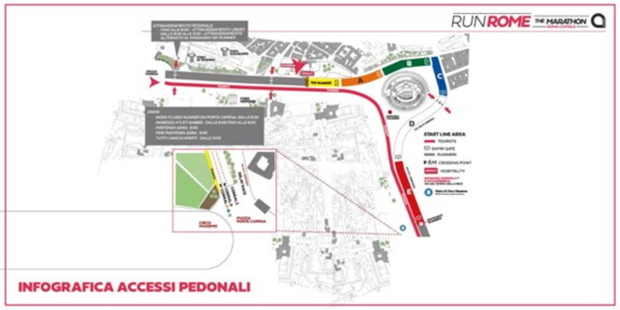 Per facilitare gli spostamenti verso l’area archeologica sono stati predisposti corridoi pedonali protetti lungo il tracciato della maratona, in particolare nella zona compresa tra Piazza Venezia, Via dei Fori Imperiali e l’area del Colosseo.