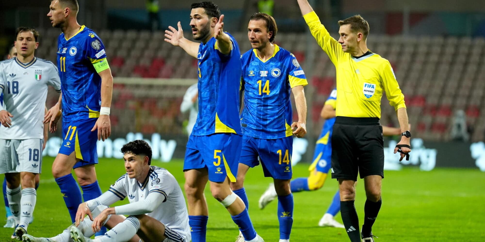 Azzurri cinici al quarto d'ora quando Barella e Kean puniscono lo svarione del portiere bosniaco per l'1-0 ma prima dell'intervallo Bastoni commette la frittata: espulsione diretta. Italia che malgrado l'inferiorità numerica si procura tre nitide occasioni per chiudere la partita ma Kean, Esposito e Dimarco le divorano (senza neanche centrare la porta) con Tabakovic che, dopo l'ennesimo miracolo di Donnarumma, firma il pari a 10 minuti dal 90'. Ai rigori gli errori di Pio Esposito e Cristante condannano la Nazionale.