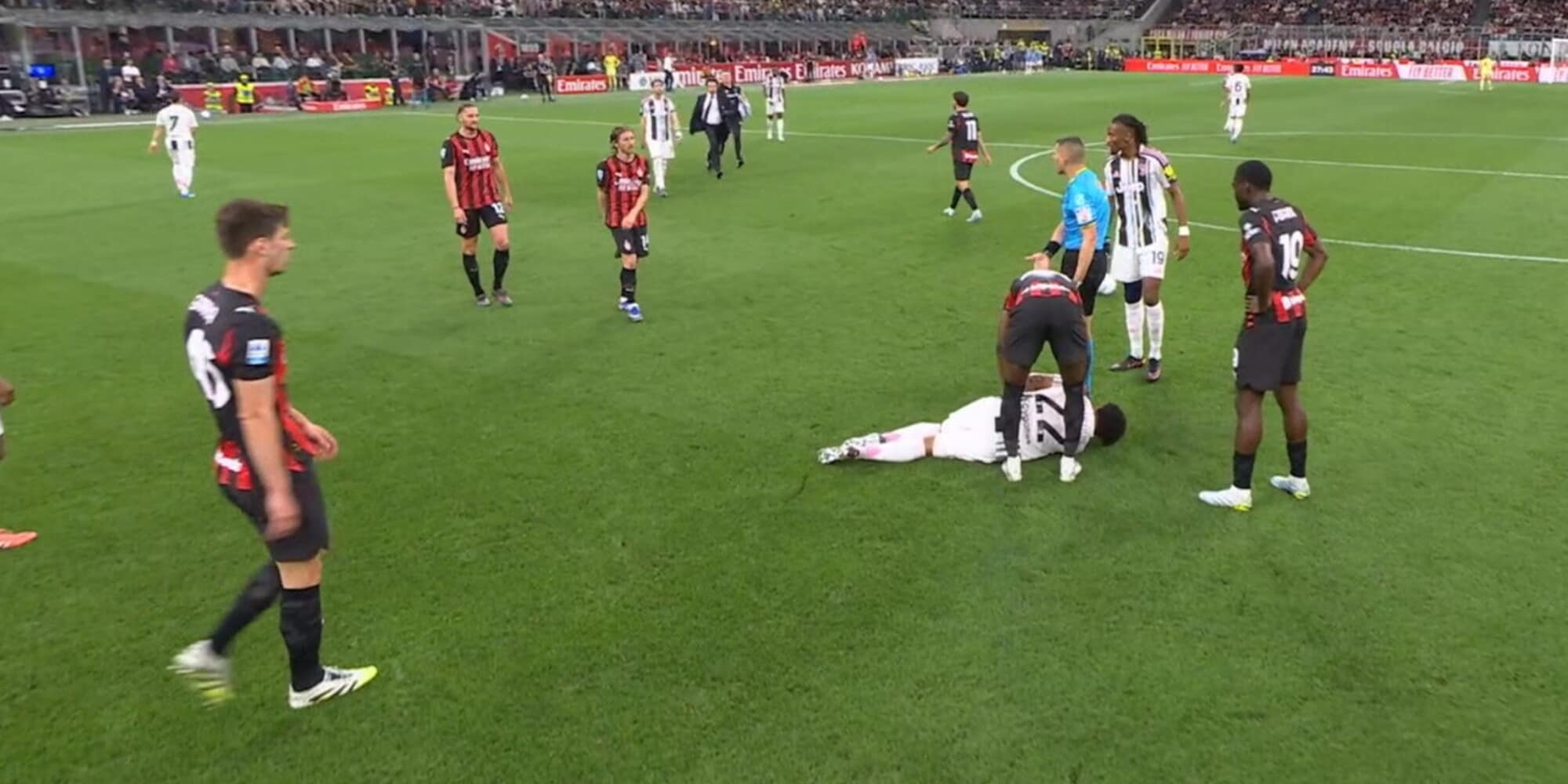 28' - Duro scontro di gioco tra il centrocampista bianconero e Tomori: McKennie cade al suolo dolorante per il colpo al mento, Sozza interrompe il gioco