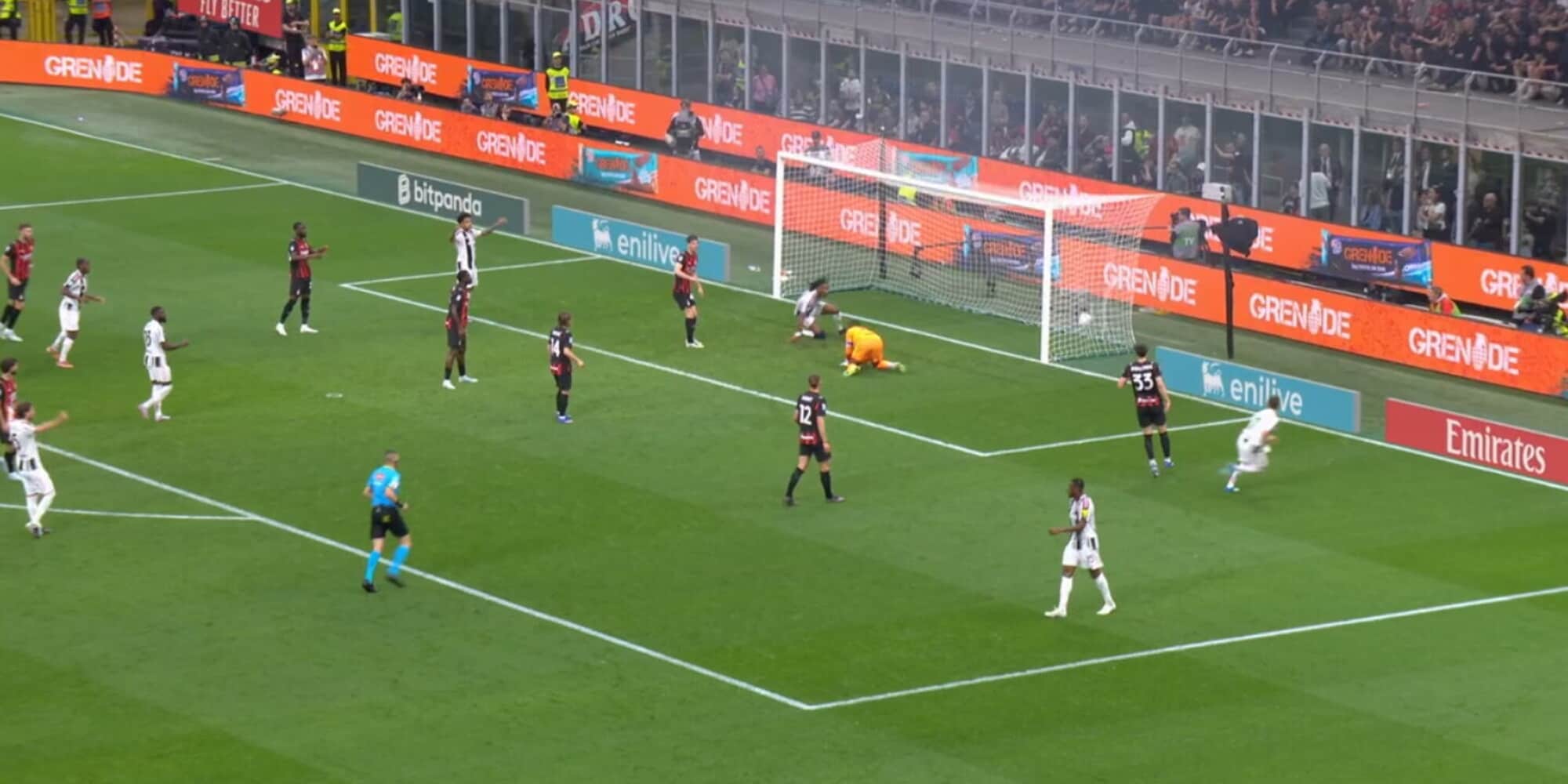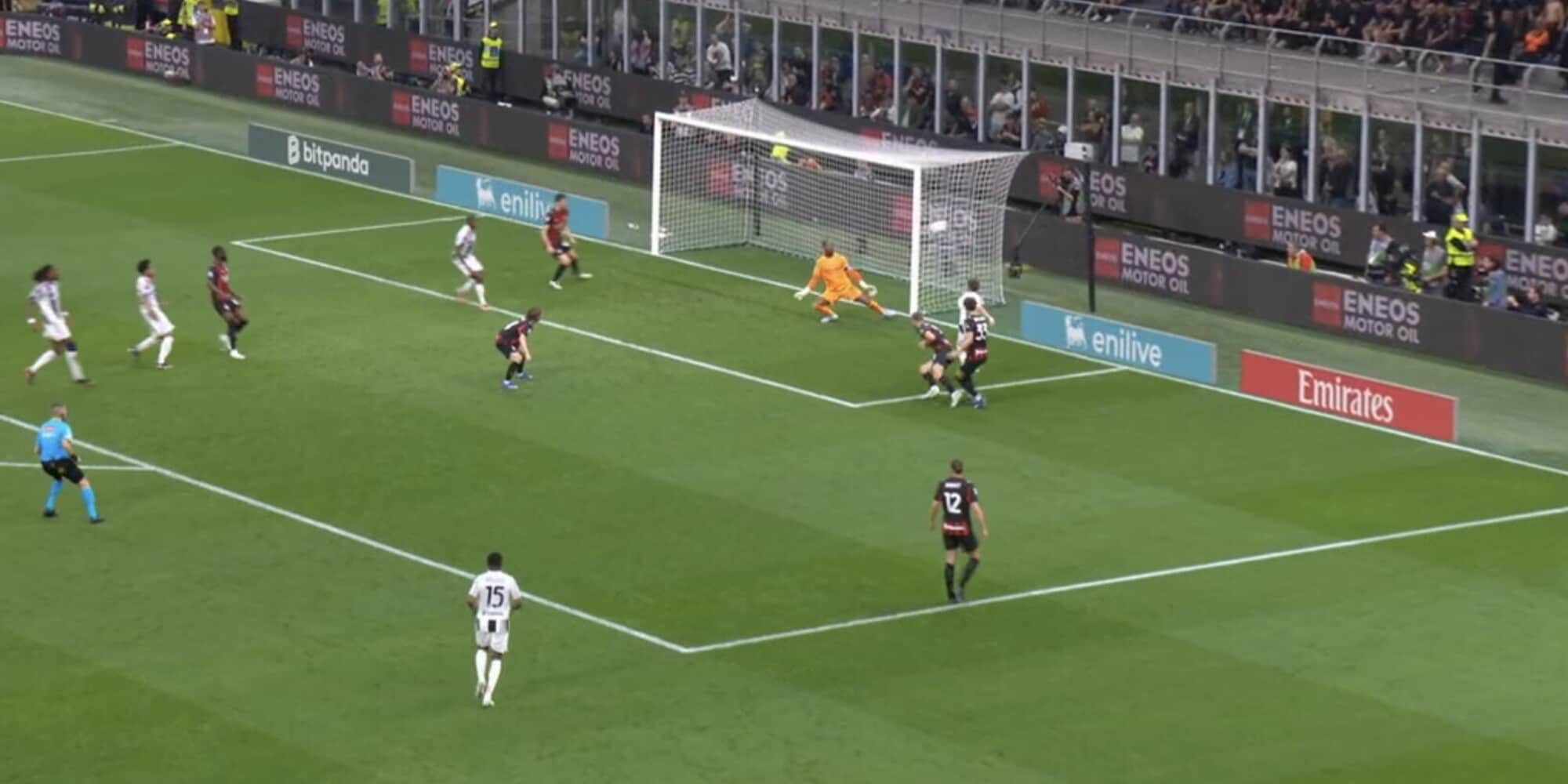 35' - Inserimento centrale di Rabiot che calcia violentemente di sinistro ma centrale, Di Gregorio è comunque reattivo e respinge. Sul continuo dell'azione palla a Leao che tenta il destro a giro da fuori, la sfera si perde abbondantemente fuori