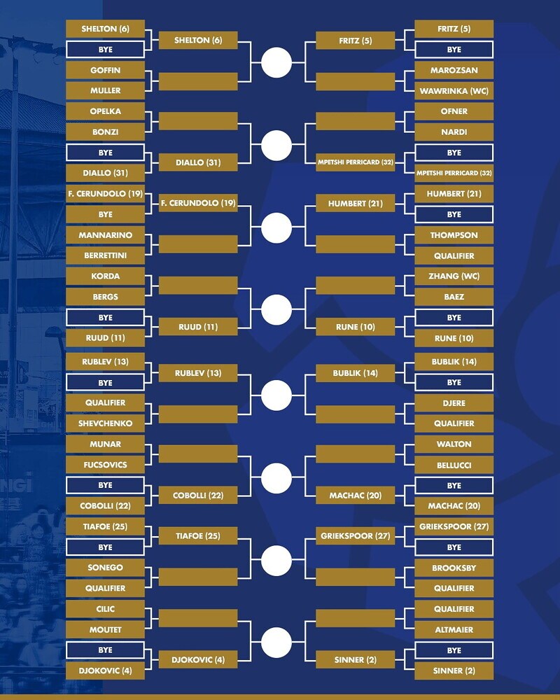 Partendo dalla parte alta del tabellone, guidata da Alcaraz, troviamo Matteo Arnaldi, che sfiderà un qualificato per poi regalarsi eventualmente la testa di serie n. 18 Alejandro Davidovich Fokina al secondo turno. Possibili incroci interessanti nel quarto presieduto da Alexander Zverev, dove Luciano Darderi (n.26 del seeding) affronterà Yunchaokete Bu o Juan Manuel Cerundolo, mentre Lorenzo Musetti (n.8) se la vedrà con Francisco Comesana o con un qualificato: se i due italiani dovessero vincere, si sfideranno al terzo turno. Scendendo invece nella seconda metà del tabellone, nel quarto presieduto da Djokovic sono stati sorteggiati altri 3 italiani. Matteo Berrettini sfiderà Adrien Mannarino, prima di un eventuale secondo turno con Francisco Cerundolo. Flavio Cobolli (testa di serie n.22) giocherà o con Jaume Munar o con Marton Fucsovics. Lorenzo Sonego, prima di affrontare Frances Tiafoe, dovrà superare un qualificato. Gli ultimi due azzurri sono presenti nella parte bassa, dove c'è Sinner. Luca Nardi avrà prima l'ostacolo Sebastian Ofner, poi in caso di vittoria Giovanni Mpetshi Perricard. Sarà Adam Walton invece l'avversario di Mattia Bellucci: chi vince troverà Tomas Machac. Non si è qualificato Giulio Zeppieri, battuto nelle qualificazioni dal ceco Dalibor Svrcina 6-2 6-4.